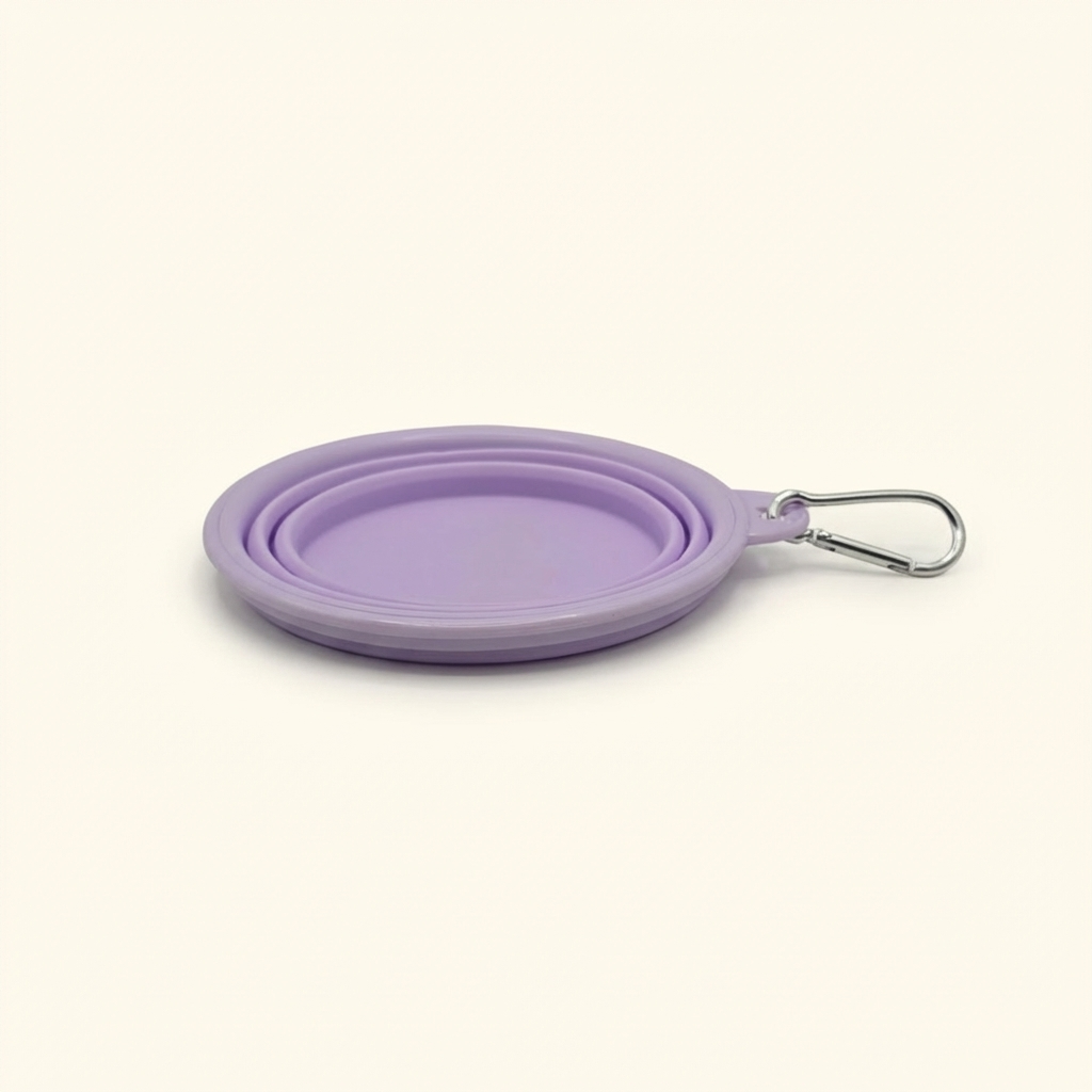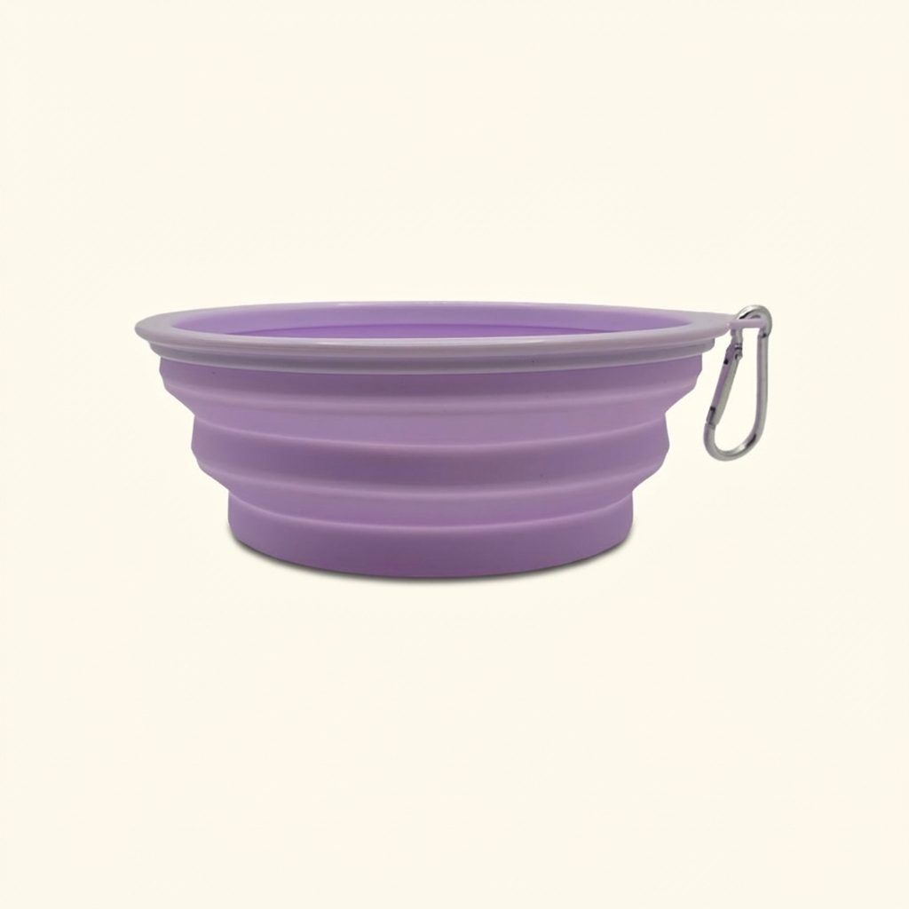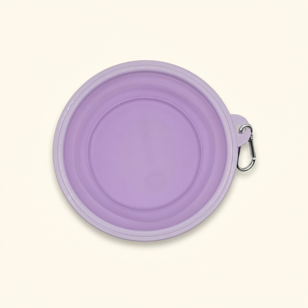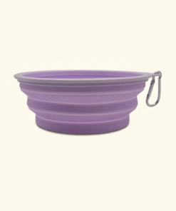 Skládací silikonová cestovní miska pro psy na vodu i krmení. Lehká, skladná a praktická na výlety, do auta i do města, s karabinkou pro snadné připnutí k batohu.