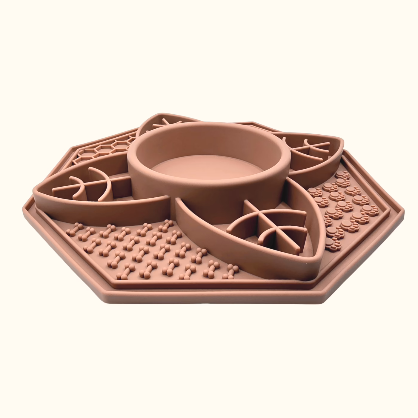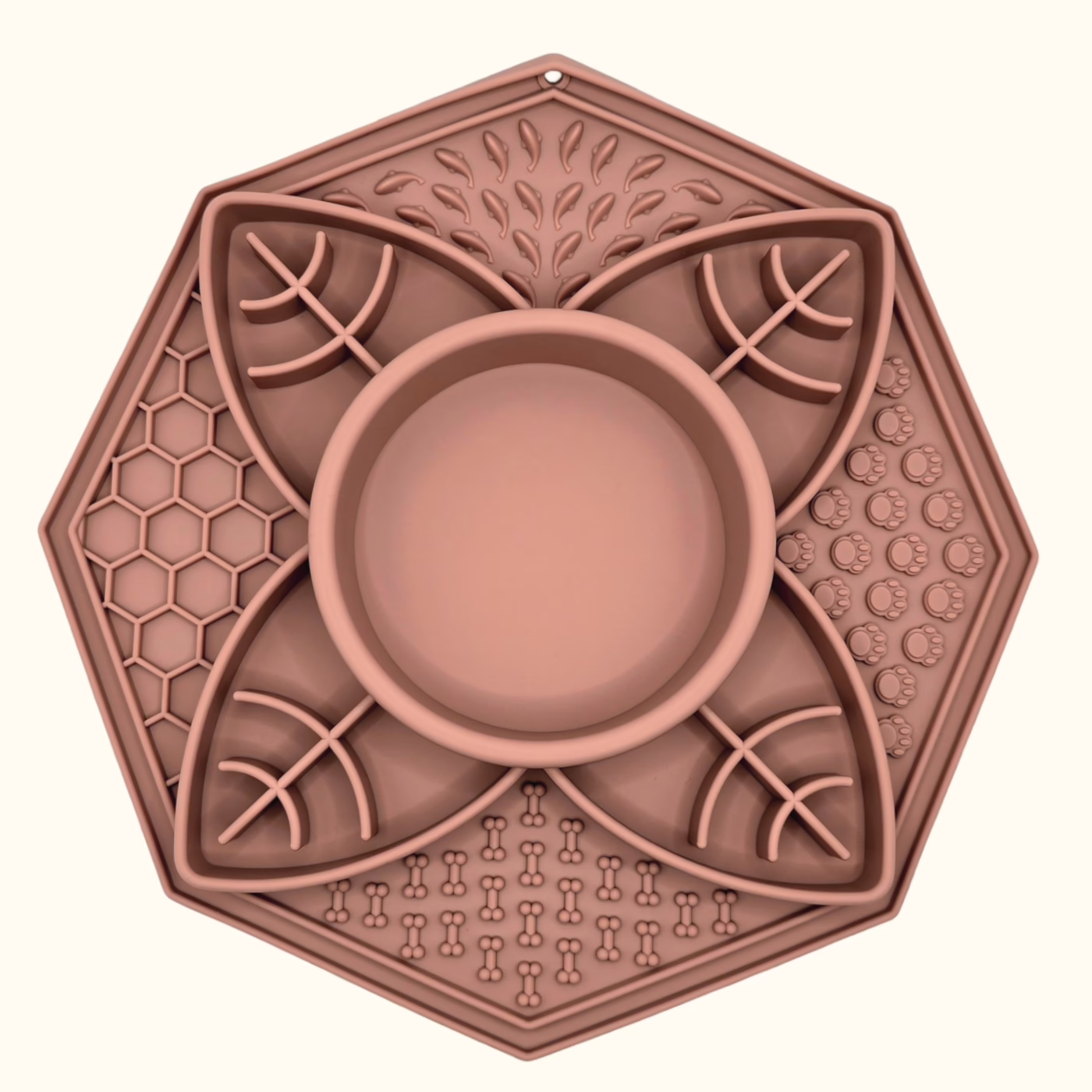 Revoluční osmiúhelníková lízací podložka Woofit Balance se čtyřmi unikátními texturami, hlubokými segmenty ve tvaru listů a praktickou centrální miskou, která poskytuje komplexní smyslovou stimulaci pro tvého pejska. Perfektní nástroj pro obohacení každodenního krmení, zmírnění stresu a podporu duševní pohody, vyrobený z prémiového potravinářského silikonu v šesti atraktivních barvách pro každý domov.